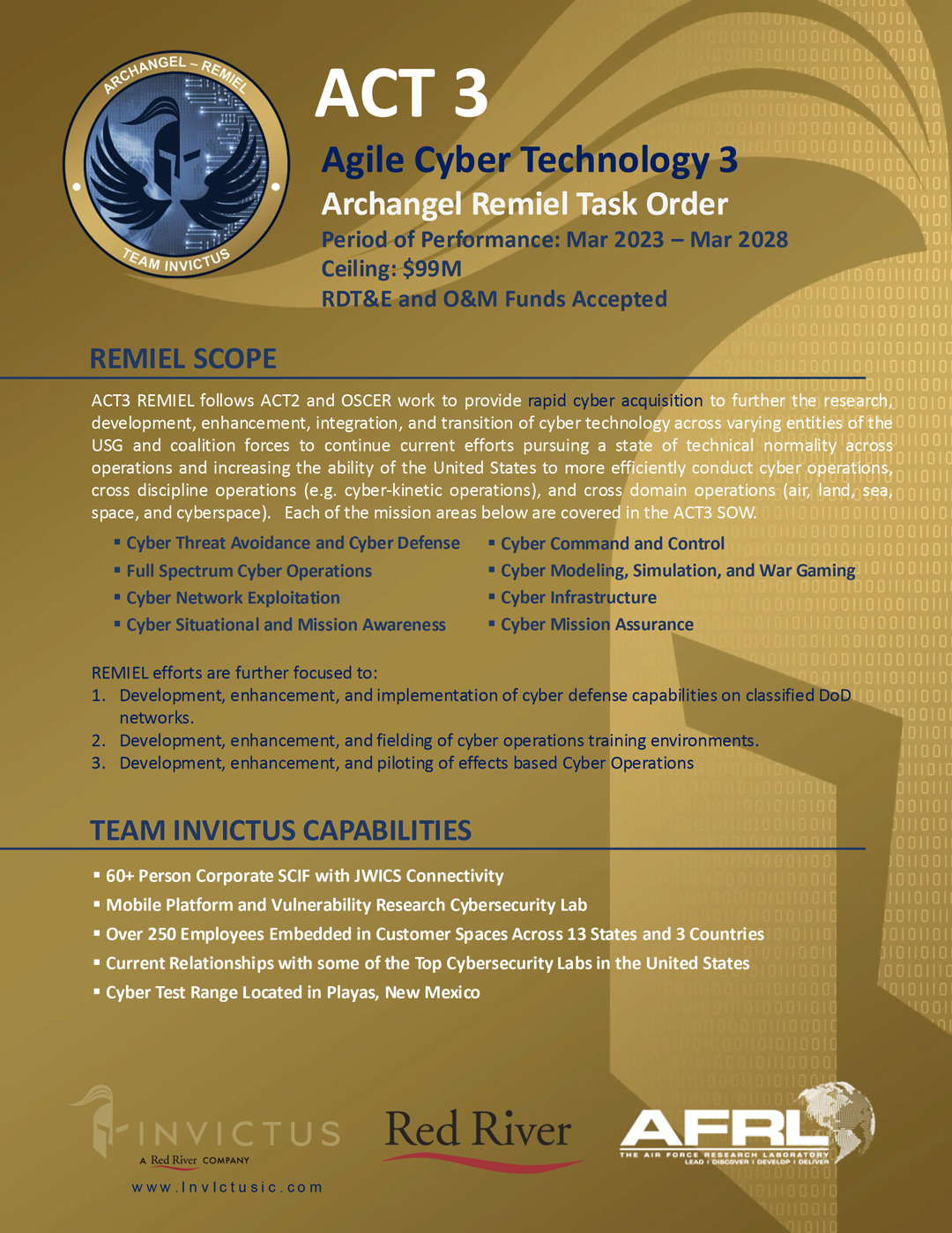 Through programs such as Agile Cyber Technology 3 (ACT3) – Archangel Remiel, Invictus delivers rapid cyber capability development, integration, and transition across DoW and coalition operations—supporting cyber defense, cyber operations, mission assurance and cross-domain activities across air, land, sea, space and cyberspace.
