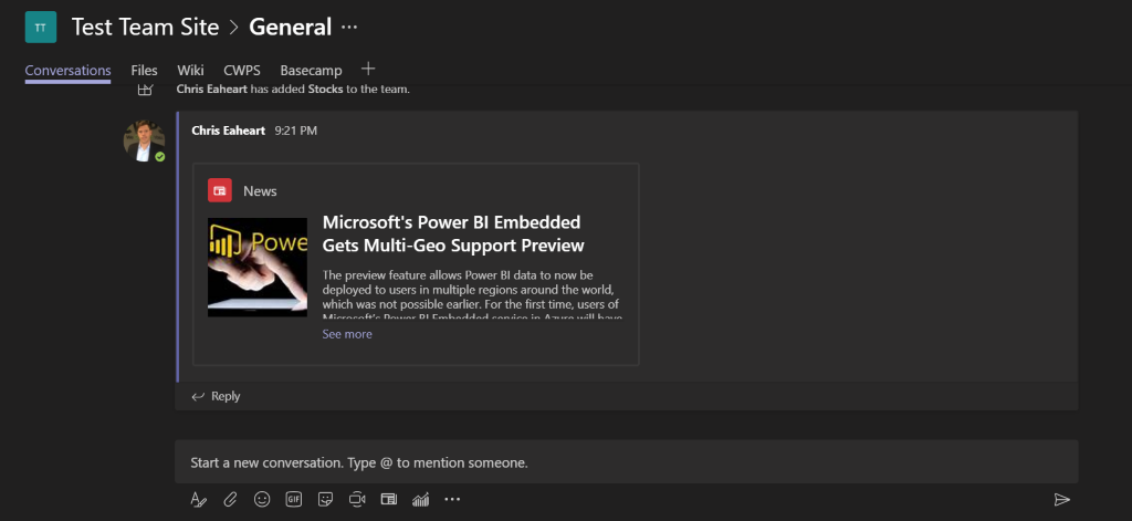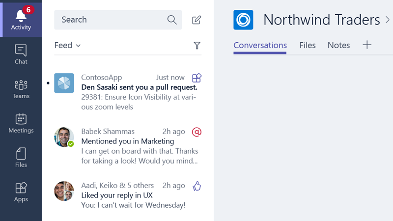 The Activity Feed in Teams pulls together all of the important updates and information from across your Teams and Channels. If you are @ mentioned, or you are following a particular channel, messages or cards will show up in your Activity Feed. It’s also possible to send messages directly to the Activity Feed from your app, allowing you to see a summary of the app’s activity, or other important updates from the app. For example, if you are using a source control system, and you would like to know when a pull request is made from one of your developers, your app can push a message directly to your activity feed indicating that has happened.