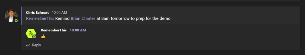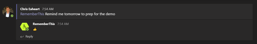 To show a simple example of the power of Bots, take the RememberThis bot as an example. By adding this Bot to your Team, your can have the Bot remind you to do certain tasks directly within the context of the Team chat.